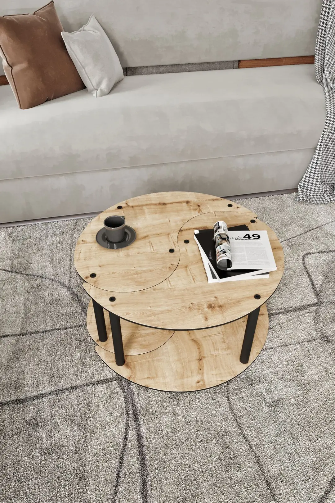 Комплектът включва две маси, което предлага гъвкавост при подреждане и възможност за адаптиране според нуждите на вашето пространство, като съчетава стил и функционалност.