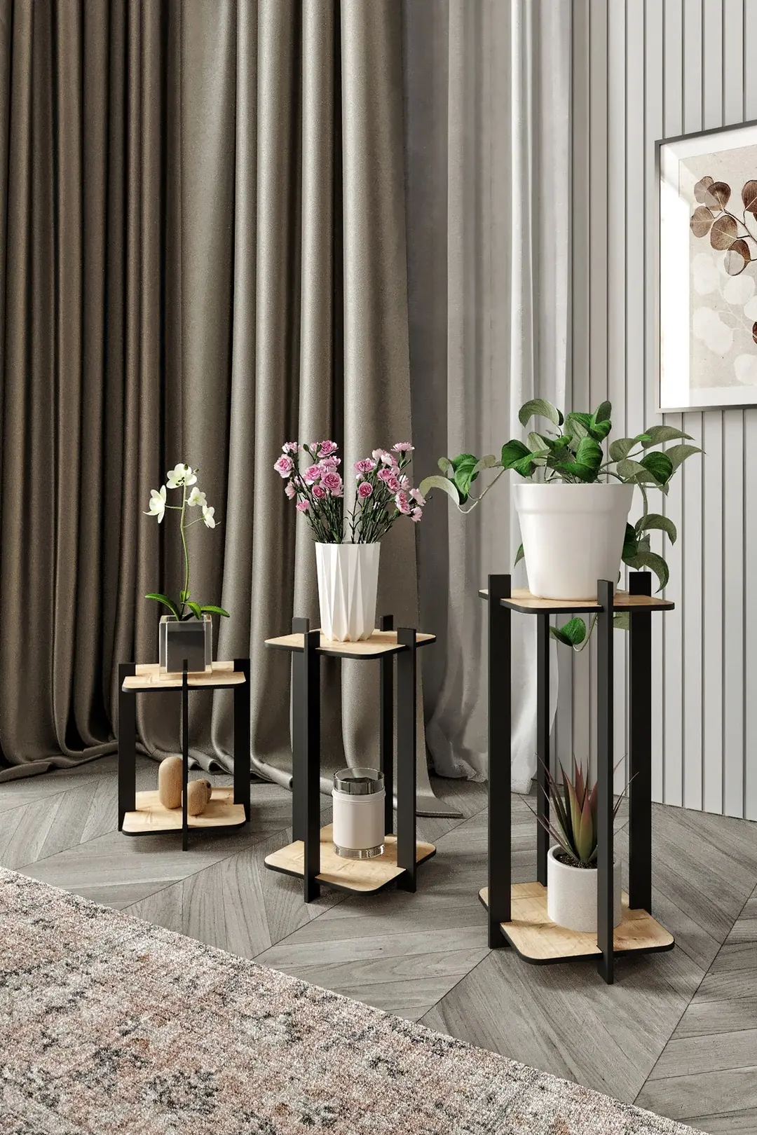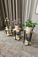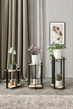 С три отделни поставки този комплект позволява идеално подреждане на саксии с различни размери и осигурява хармонична декоративна композиция. Изработени от здрав дъбов материал, саксиите гарантират дълготрайна употреба, като съчетават функционалност с естетика. Комплектът придава на всяко пространство модерен, изискан и внимателно обмислен вид.