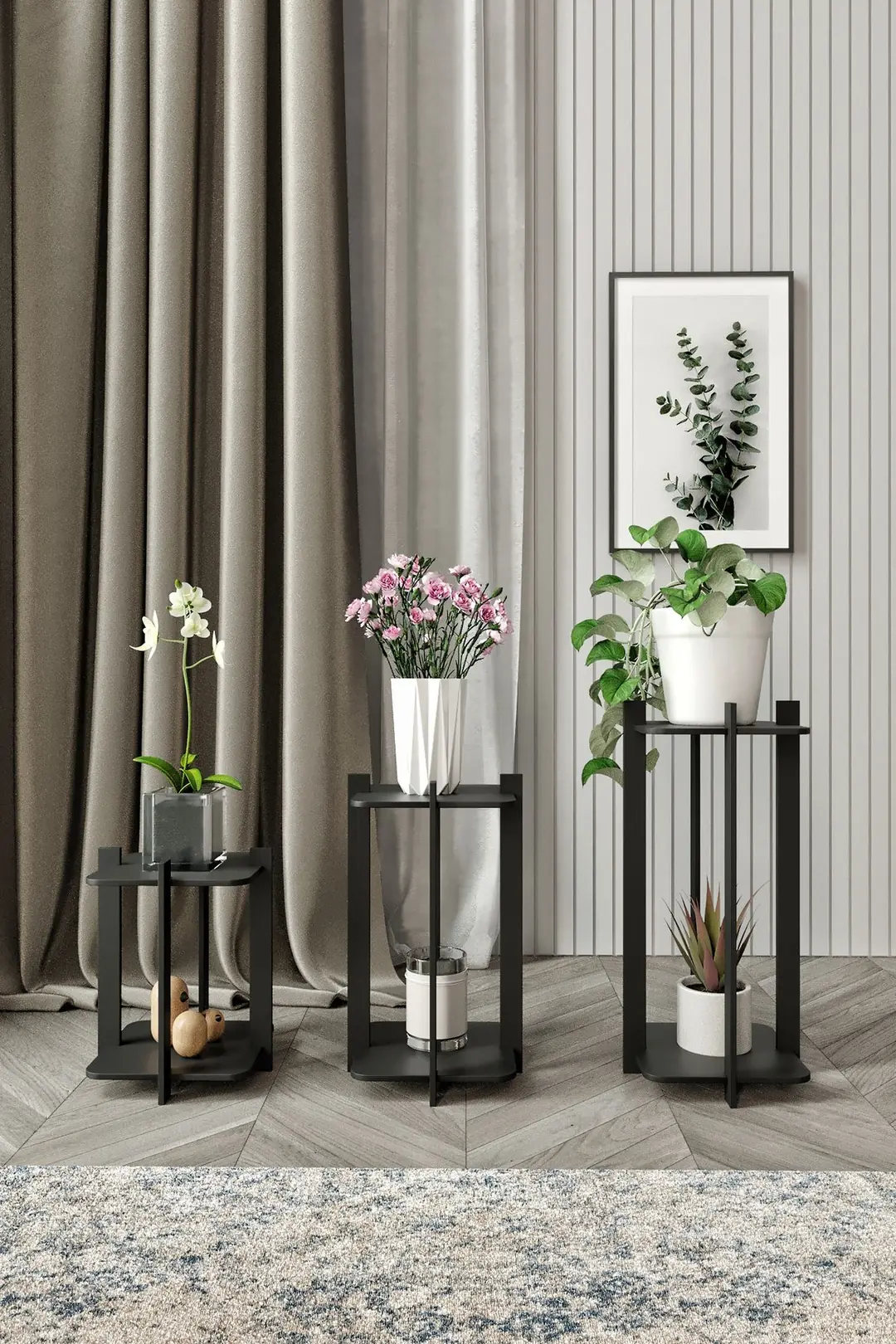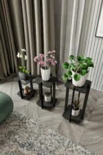Комплектът от три броя позволява перфектно подреждане на растения с различни размери, създавайки хармонична и визуално привлекателна композиция. Черният цвят предлага класическа и универсална визия, която лесно се интегрира във всякакъв интериор и добавя изискан и съвременен акцент.