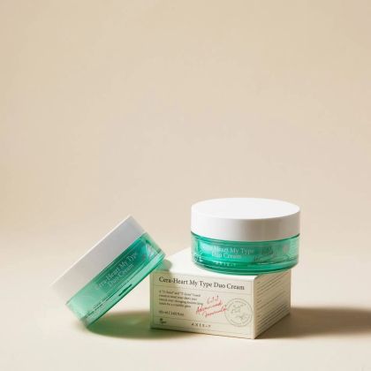 Axis-Y Cera-Heart My Type Duo Cream е иновативен овлажнител с двойна формула, съчетаващ два различни типа крем в една опаковка – Ceramide-rich крем за интензивно подхранване и успокояващ гел крем с лека текстура. Създаден е така, че да отговаря на различните нужди на кожата – по-сухи участъци получават дълбока хидратация, докато мазните или чувствителни зони се освежават без утежняване. Формулата съдържа 5 вида керамиди, Centella Asiatica и растителни екстракти, които възстановяват, успокояват и укрепват бариерната функция.