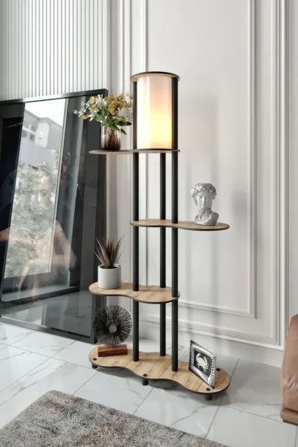 Messer лампион с рафтове – MDF, разглобяем, E27 (до 20 W), кабел 2 м с ключ, рафтове 65×35 см, височина 155 см, абажур 17×80 см.