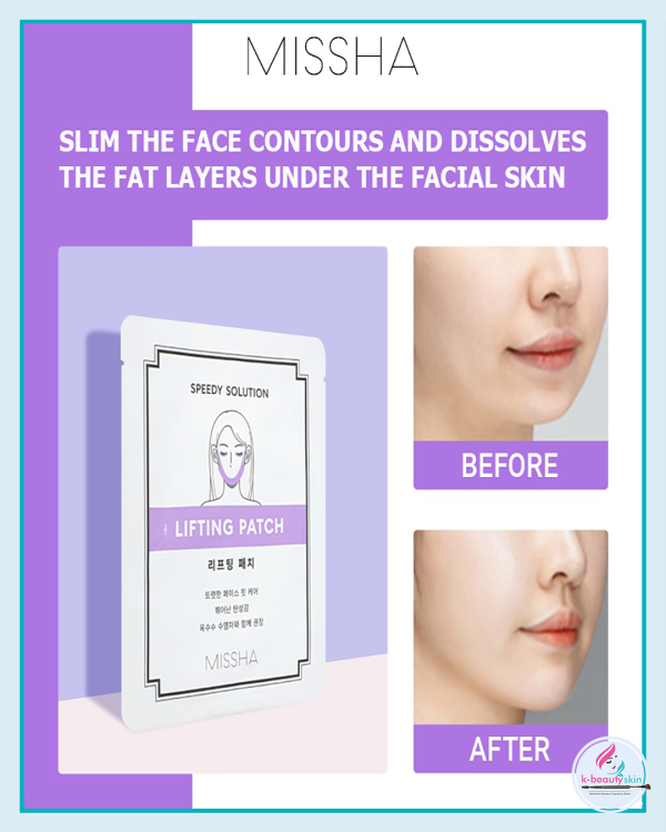 MISSHA Speedy Solution Lifting Patch (8 g) е иновативен лифтинг пластир, създаден за бързо и ефективно стягане и оформяне на контура на лицето. Той е специално разработен за зоната на брадичката и долната част на лицето, където кожата най-често губи своята еластичност и ясно изразен контур.