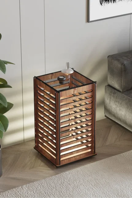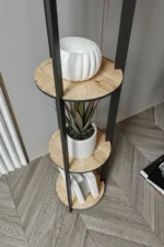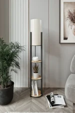 Декоративна подова лампа с рафт, доставяна в разглобен вид за удобен транспорт. Изработена изцяло от 1-ви клас MDF, без използване на сунталам. Продуктът отговаря на европейските стандарти за качество и E1 норма, като не съдържа канцерогенни вещества. Подходяща за хол, спалня, офис или кът за четене, съчетава осветление и практично място за съхранение.