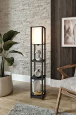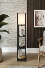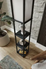 Подова лампа Messer с рафт – модерен и функционален дизайн, изработена от висококачествен MDF (E1), лесен монтаж без инструменти, фасунга E27, кабел 2 м с ключ. Идеална за хол, спалня или офис.