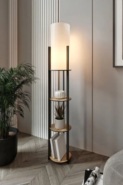 Декоративна подова лампа с рафт, която се доставя в разглобен (демонтиран) вид за по-лесен транспорт. Произведена е от висококачествен MDF, отговарящ на европейските стандарти, и не съдържа канцерогенни вещества (E1 норма). Съчетава осветление и практично място за съхранение, което я прави идеална за хол, спалня, офис или кът за четене.