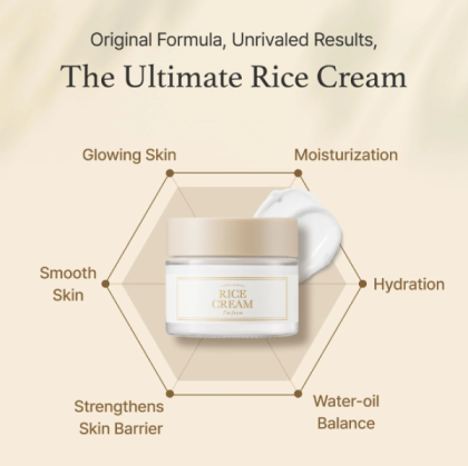 Rice Cream на I’m From е висококачествена хидратираща крем-терапия, създадена с Rice Bran Essence Complex — мощна комбинация, вдъхновена от корейската традиция за грижа за кожата. Формулата е насочена към възстановяване на влагата, подобряване на еластичността и видимо изсветляване на тена.