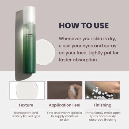 Затворете очи и напръскайте равномерно върху лицето от разстояние около 20–30 см. Използвайте при нужда от освежаване и хидратация през деня или като финален хидратиращ етап в грижата за кожата.