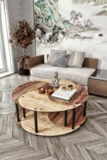 Холната маса Yin Yang Unity Serenity в комбинация Сафирен дъб и Мадран орех съчетава модерен стил, елегантност и практичност. С диаметър 90 см и здрав дизайн, тя осигурява просторна повърхност и дълготрайна употреба.