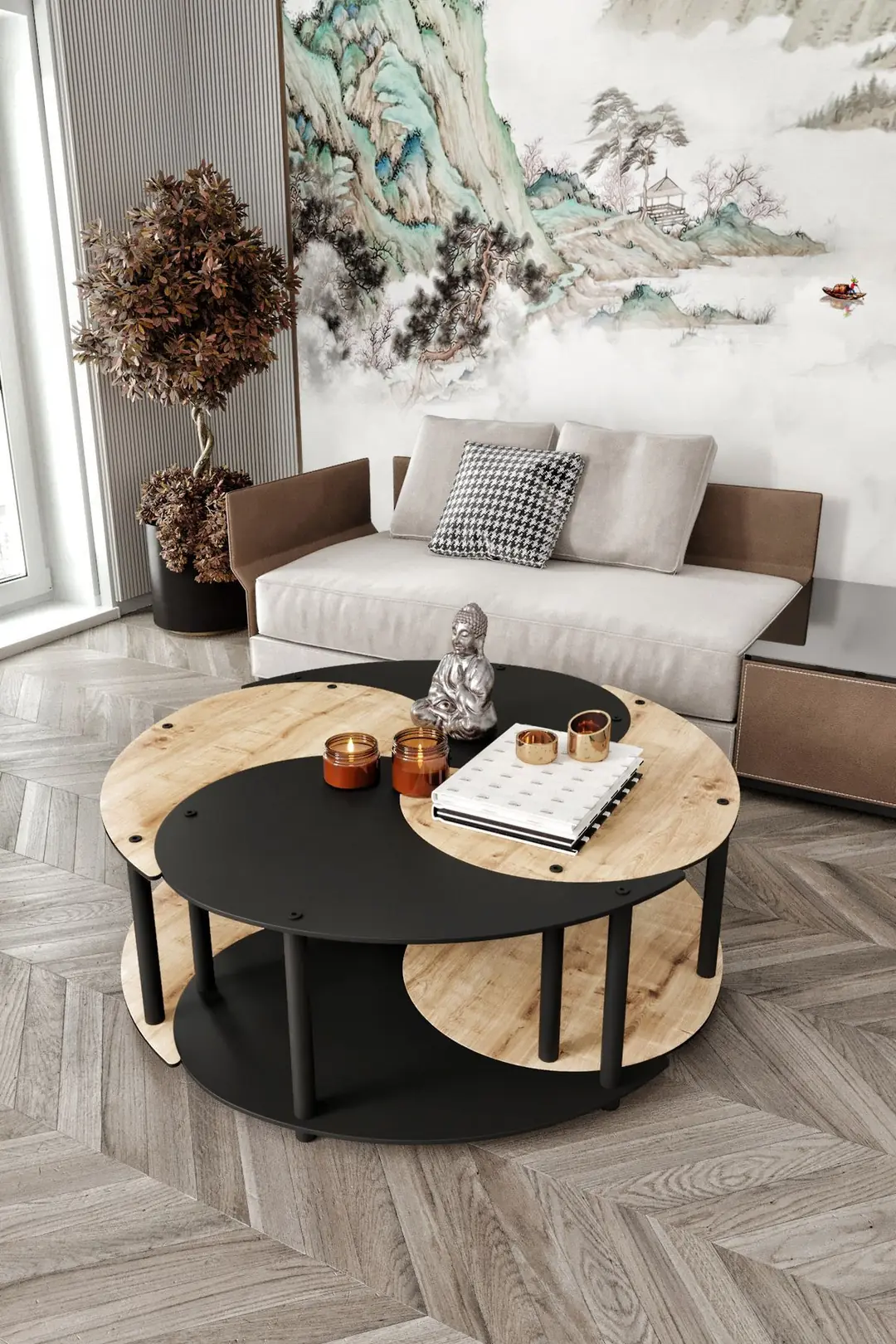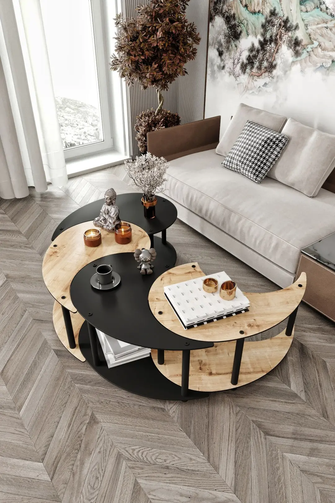 Холната маса Yin Yang Unity Serenity съчетава изискан модерен дизайн и практична функционалност, превръщайки се в стилен акцент за всяка всекидневна. Нейната кръгла форма придава елегантност и визуална лекота, като същевременно допринася за по-хармонично и уютно пространство.