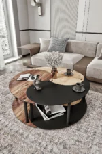С диаметър 90 см масичката предлага просторна и функционална повърхност, подходяща за книги, кафе, списания и декоративни елементи. Комбинацията от сапфирен орех, мадран орех и черен цвят създава изискан и дълбок визуален ефект, който лесно се вписва в съвременни и дизайнерски интериори.