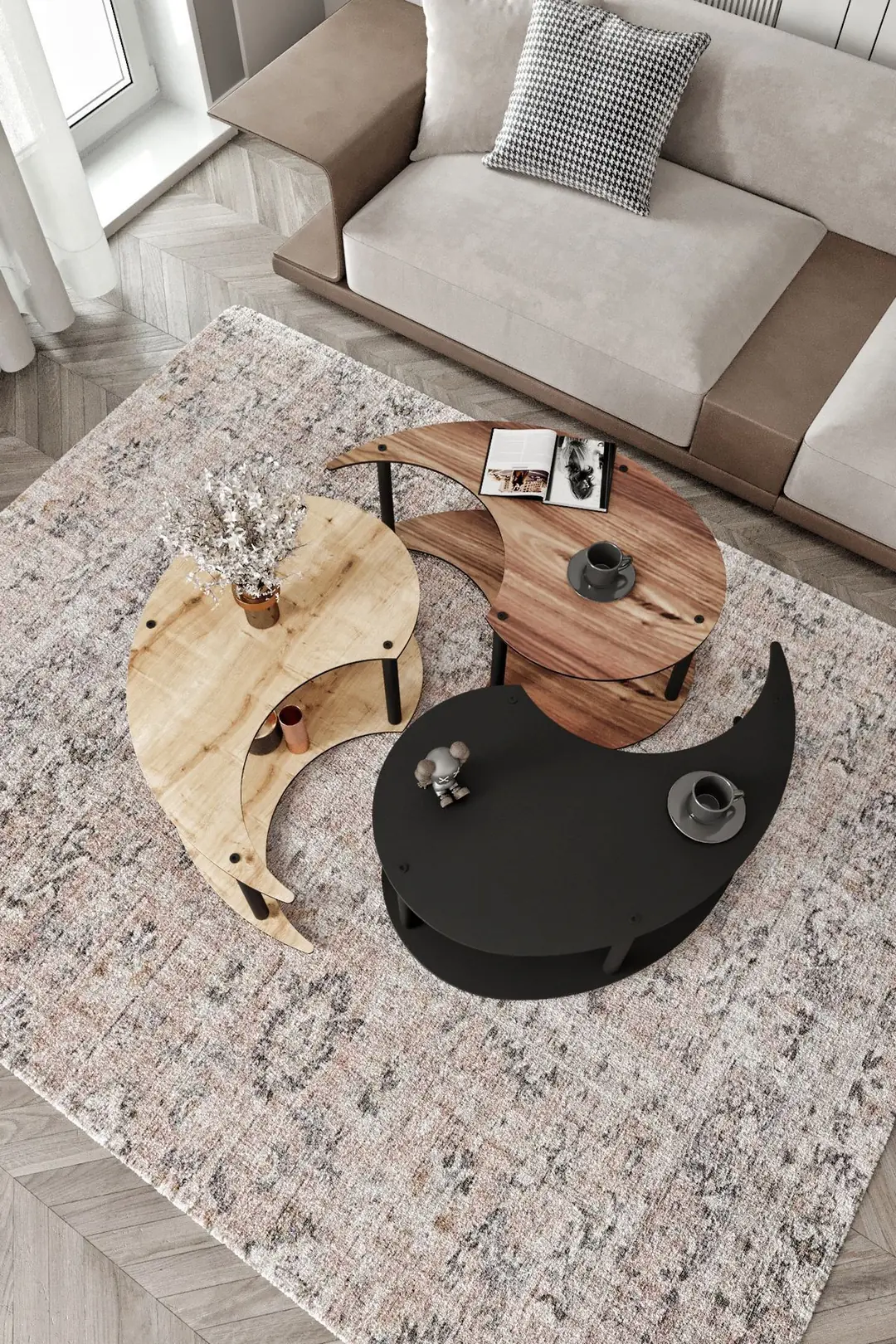 Холна масичка Yin Yang Unity Serenity – тройна, сапфирен орех, мадран орех и черен цвят, 90 см