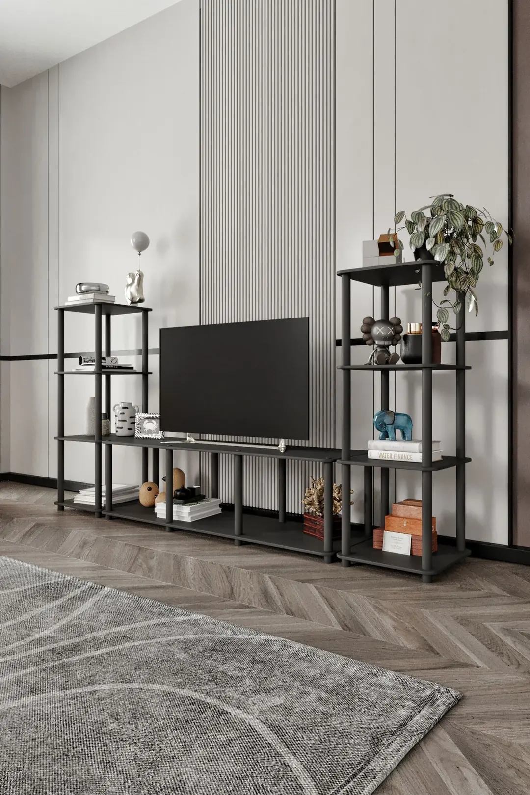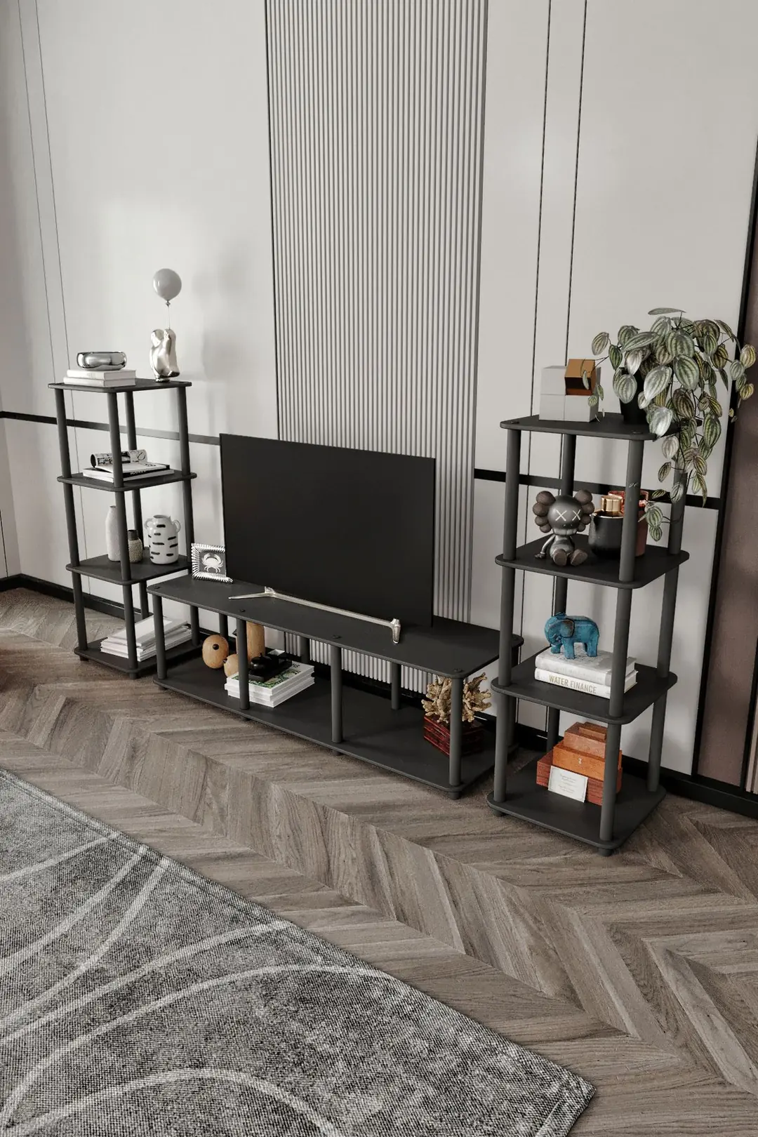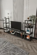 Холната маса Masivo предлага удобно място за телевизор и аксесоари, като рафтовете осигуряват допълнително пространство за книги или декорации, придавайки подреден и модерен вид на вашия хол.