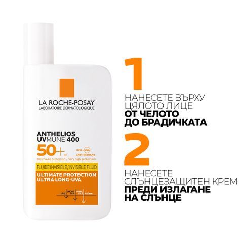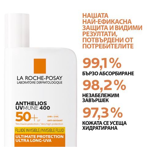 La Roche-Posay Anthelios UVMUNE 400 SPF50+ е ултра лек слънцезащитен флуид, който осигурява широкоспектърна UVA/UVB защита и защита от видимата светлина и инфрачервените лъчи. Формулата е обогатена с термална вода La Roche-Posay, която успокоява и укрепва кожната бариера. Флуидът се абсорбира бързо, оставя невидим и матов завършек и е специално разработен за чувствителна кожа, склонна към слънчеви реакции.